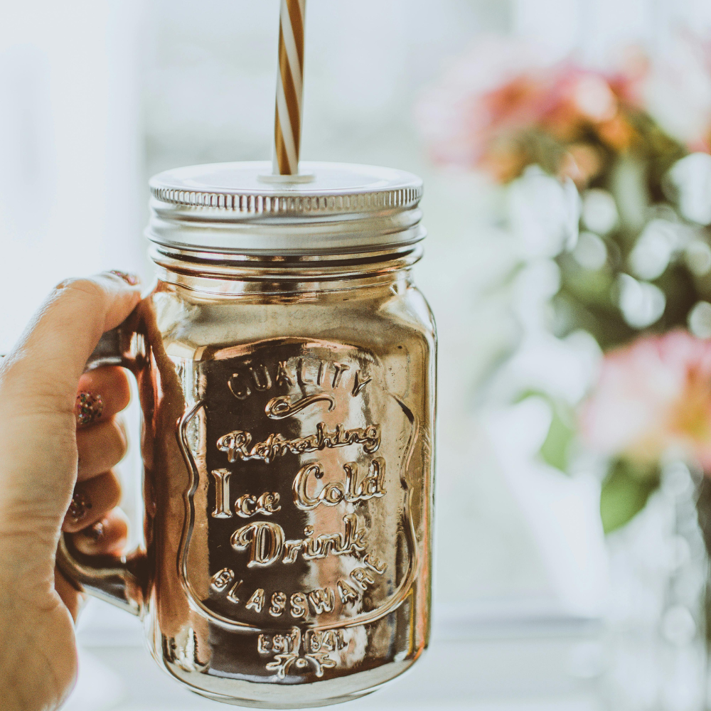 With a diameter of 3.1″ and a height of 5.1″, each of these customized mason jars come with a twist-on stainless steel lid and a reusable straw.